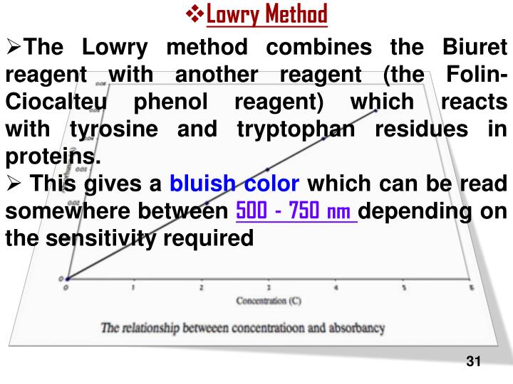 PPT - Physical-chemical properties of proteins; methods of ... from image3.slideserve.com Do not use sarstedt plates. The color is not always proportional to concentration.inspite of all these concerns, folin's method can be used in. This protocol is adapted for the use of microplates and photometer readers. Samples in the range of 5 to 200 μg/ml are measured at 750 nm and quantified. The principle involved in lowry method is determining the protein concentration by. The procedure of lowry et al. Although the lowry method uses standards for calibration, which can be a source of error as the one disadvantage of the lowry method is that many common substances, such as k+, mg2 +, nh4+. Looking for online definition of lowry method in the medical dictionary?